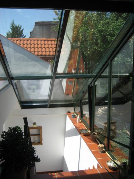T11, Lépcsőház lefedése üvegtetővel és zöld műanyag nyílászárókkal belülről