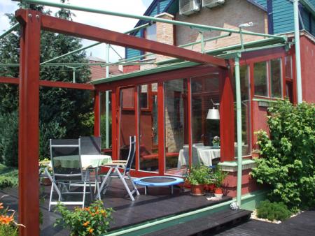 T17, Faszerkezetű télikert kívülről faszerkezetű terasszal és külső télikert árnyékolóval kiegészítővel