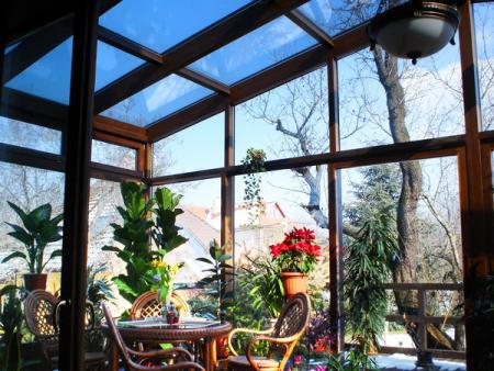 T70, Fa alumínium szerkezetű télikert integrált tolóajtóval és üvegtetővel, a virágok kedvence