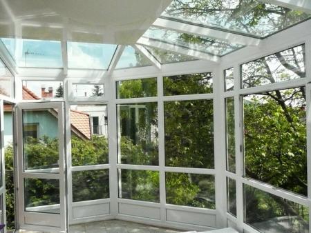 T69, Műanyag szerkezetű télikert üvegtetővel emeleti teraszon, belülről