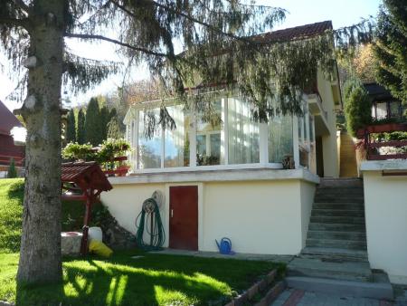 T2, Fehér műanyag télikert üvegtetővel a fenyőfa árnyékában