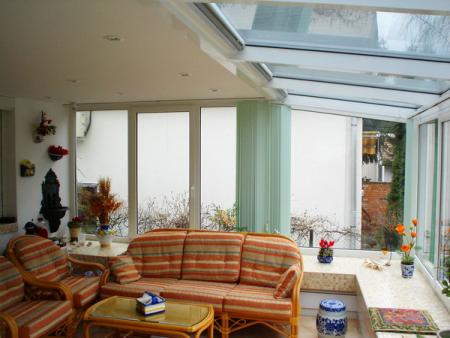 T93, Műanyag nyílászárókkal épült télikert, szalagfügönnyel árnyékolva